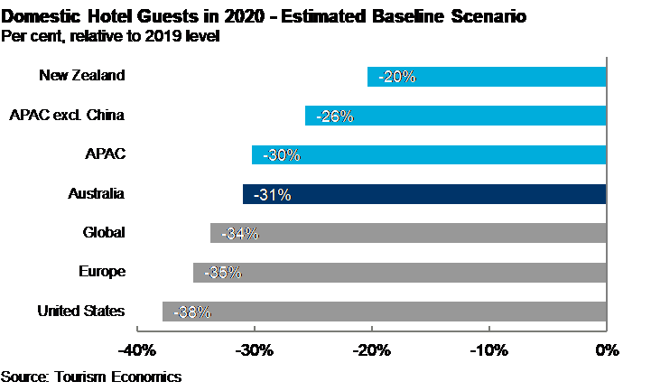 Australia, like many countries in the Asia-Pacific (APAC) region, has restricted entry to international travellers since the COVID-19 pandemic began. This has resulted in relatively large negative impacts on inbound travel, but also allowed the spread of the virus to be controlled relatively effectively and therefore facilitated a quicker return to some sort of normality – including domestic tourism. Indeed, the estimated decline in domestic hotel guests in APAC in 2020 (30%, and 26% excluding China) is the smallest of any region. However, Australia’s experience with domestic tourism differs from most other countries in the region, as discussed in Tourism Economics’ recent Research Briefing.