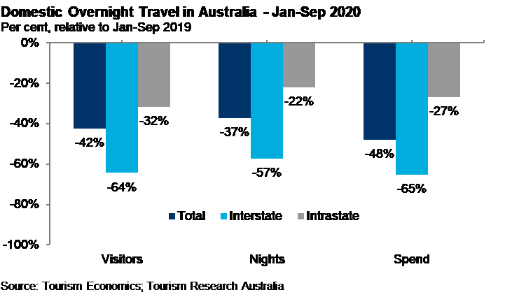 Australia’s approach to domestic travel restrictions has been very different to the rest of APAC and most of the world. Tourism Economics estimates that Australian domestic hotel guests in 2020 were at least 31% lower than in 2019 – the largest fall of all APAC countries except for China. Many of Australia’s eight states and territories closed their borders to domestic travellers from other states or cities at various stages throughout 2020 (and continuing into 2021), often in response to only a very small increase in new infections. While limiting the spread of infections outside the two largest states – New South Wales and Victoria, who receive the bulk of returned residents and therefore ‘imported’ COVID-19 cases – this has had a significant negative impact on interstate travel. This type of tourism accounted for one-third of domestic trips and more than half of domestic spending in 2019, and with state border closures severely limiting these trips for much of 2020, the impact on aggregate domestic tourism has been notable.