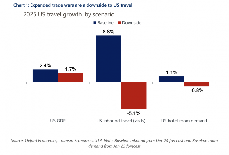 Under the expanded trade war scenario, GDP growth in 2025 is now projected to slow to 1.5%, down from 2.4% in the baseline scenario. Within the travel sector, the expected impact is significant:
