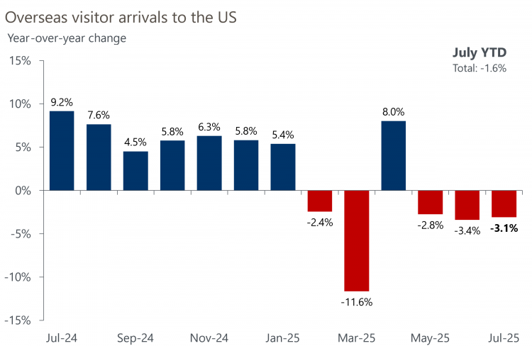 Overseas arrivals dropped 3.1% in July, bringing the year-to-date (YTD) decline to 1.6%, with losses driven by decreases from Western Europe and Asia.